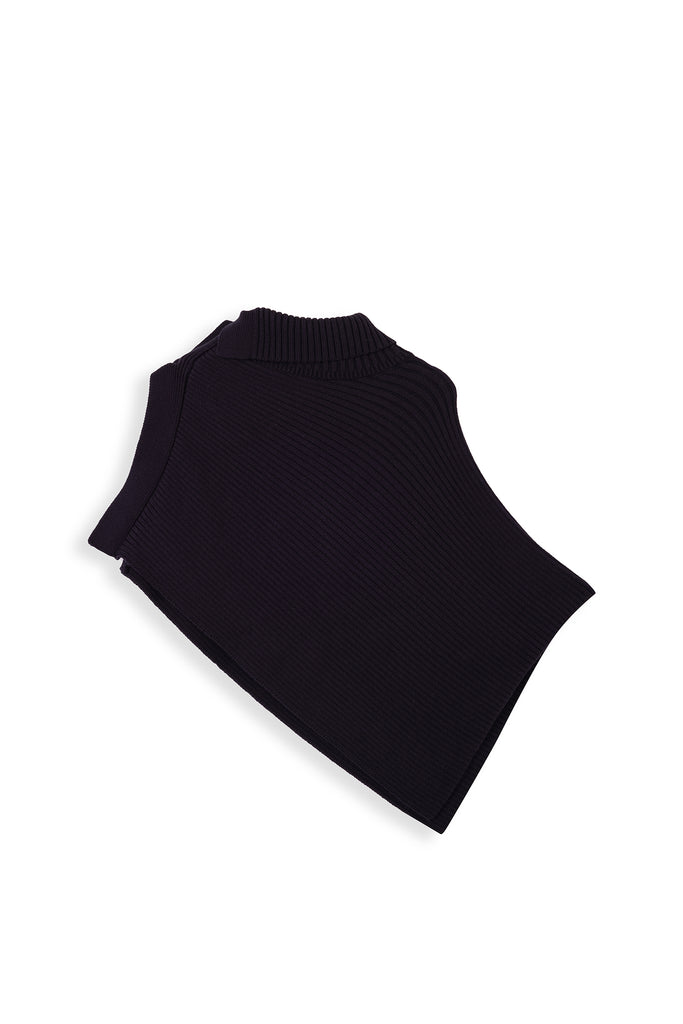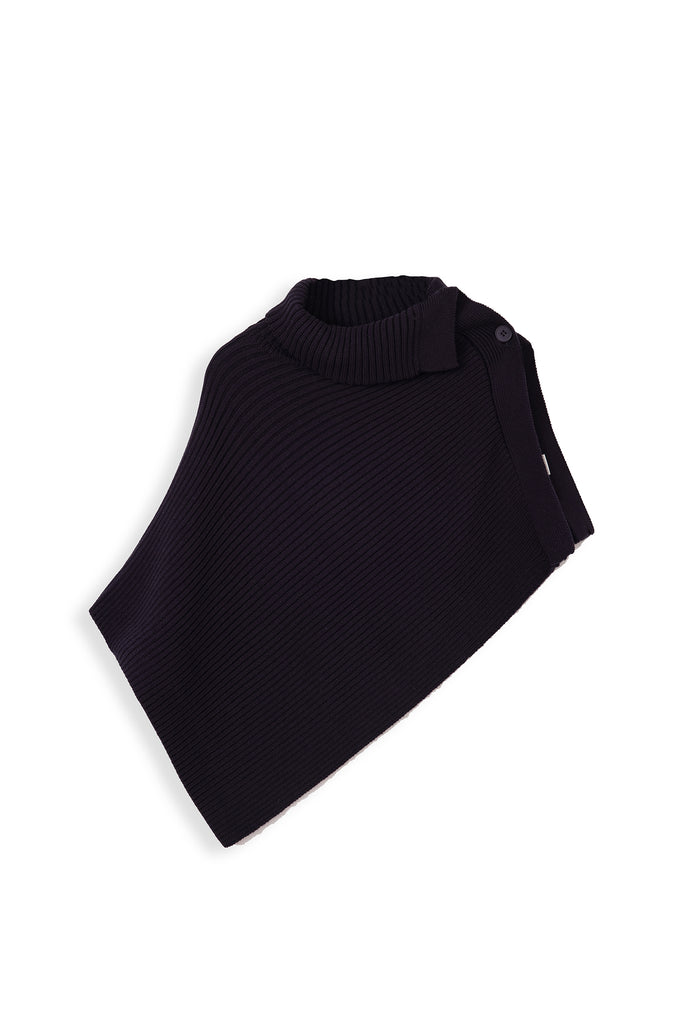 Asymmetric knit cape with ribbed texture, button fastening at shoulder, draped silhouette, effortlessly modern.