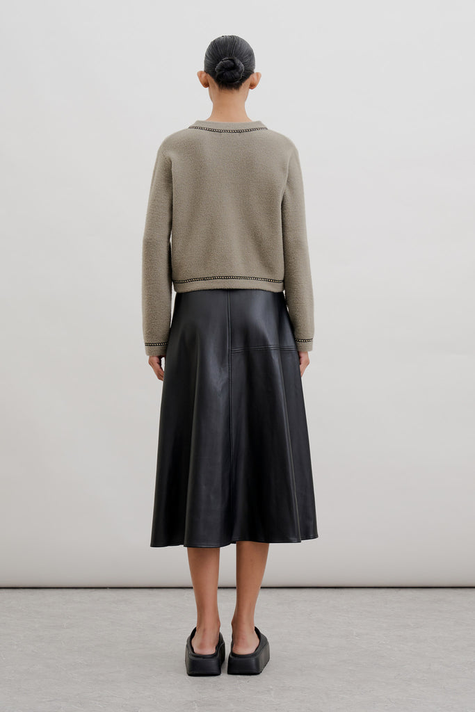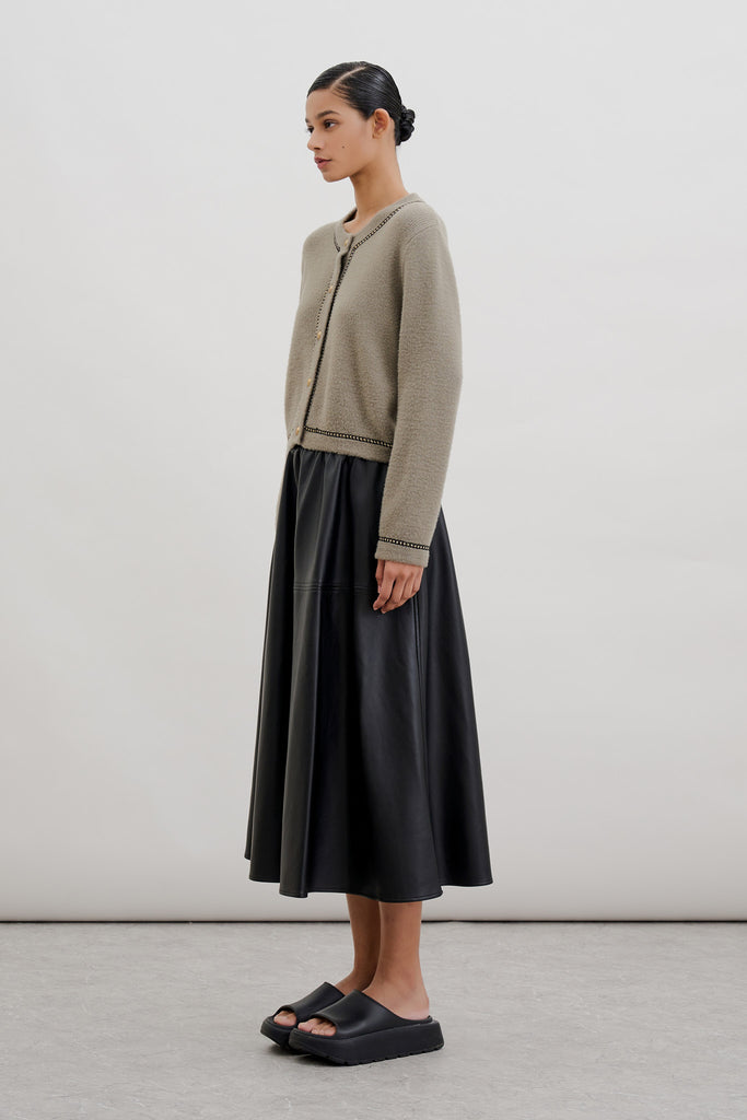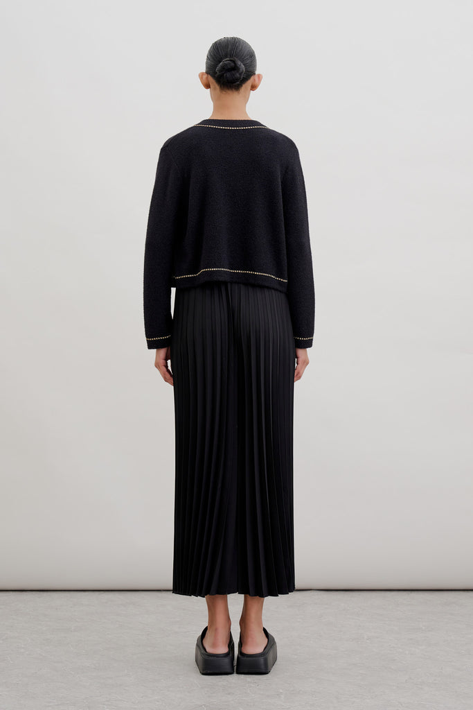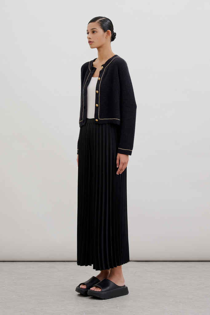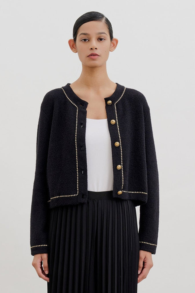 Slip into the Chain Trim Knit Cardigan and embark on a journey of timeless elegance, where every glint of its metallic trim whispers tales of chic sophistication.