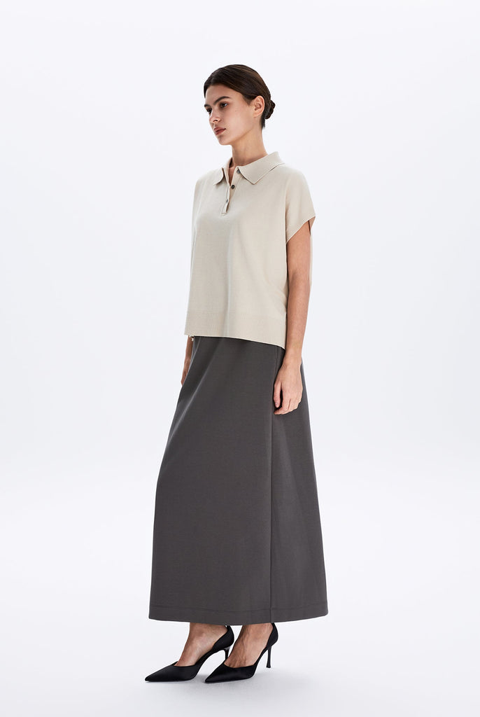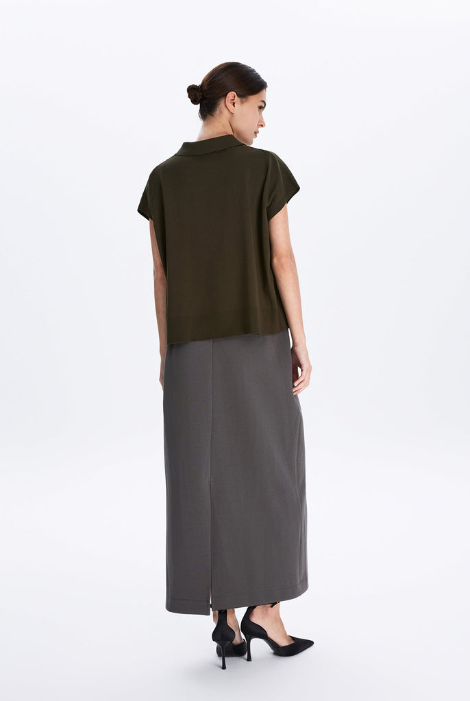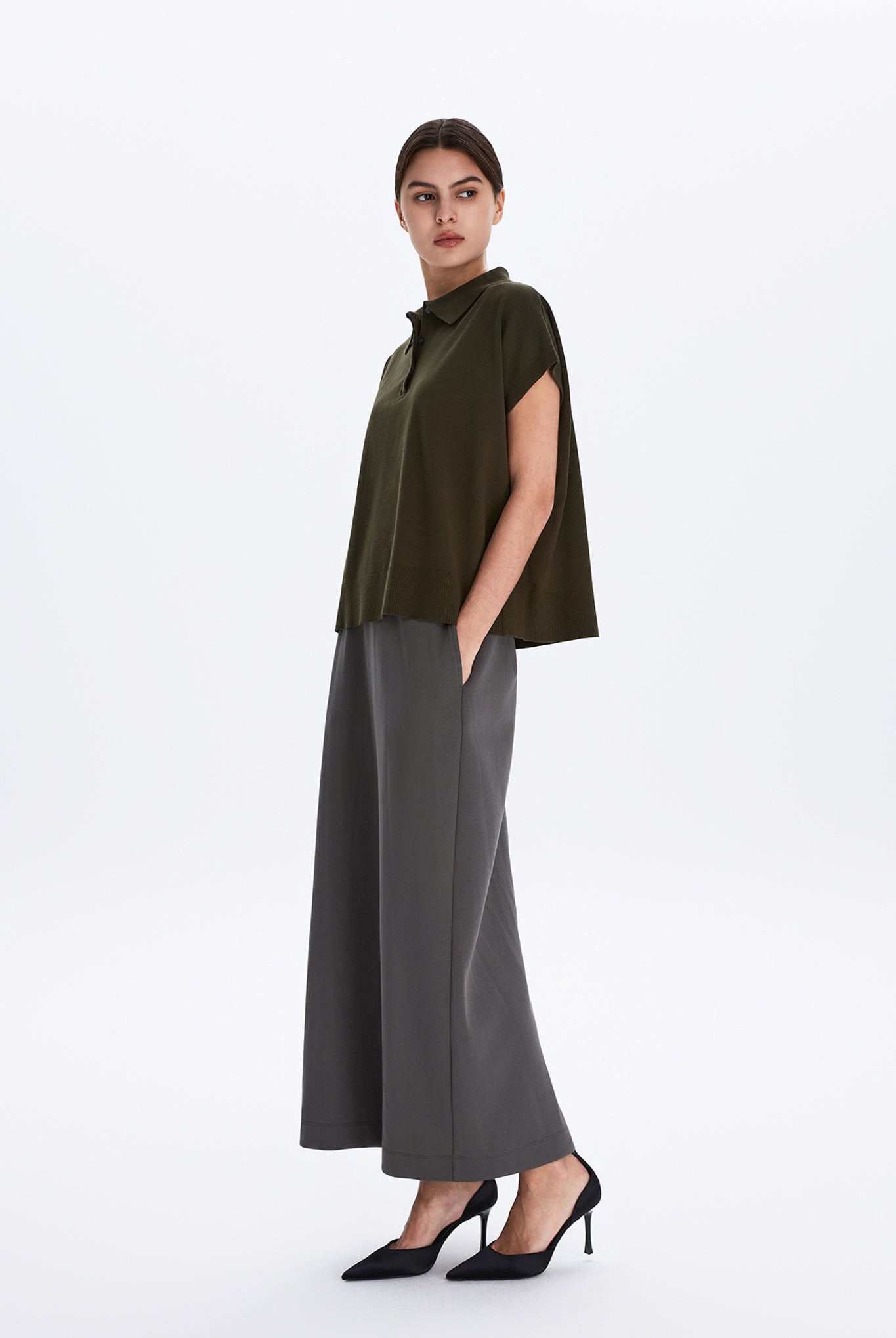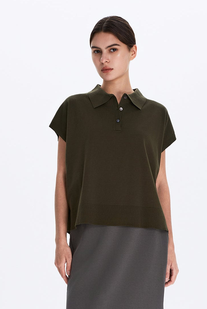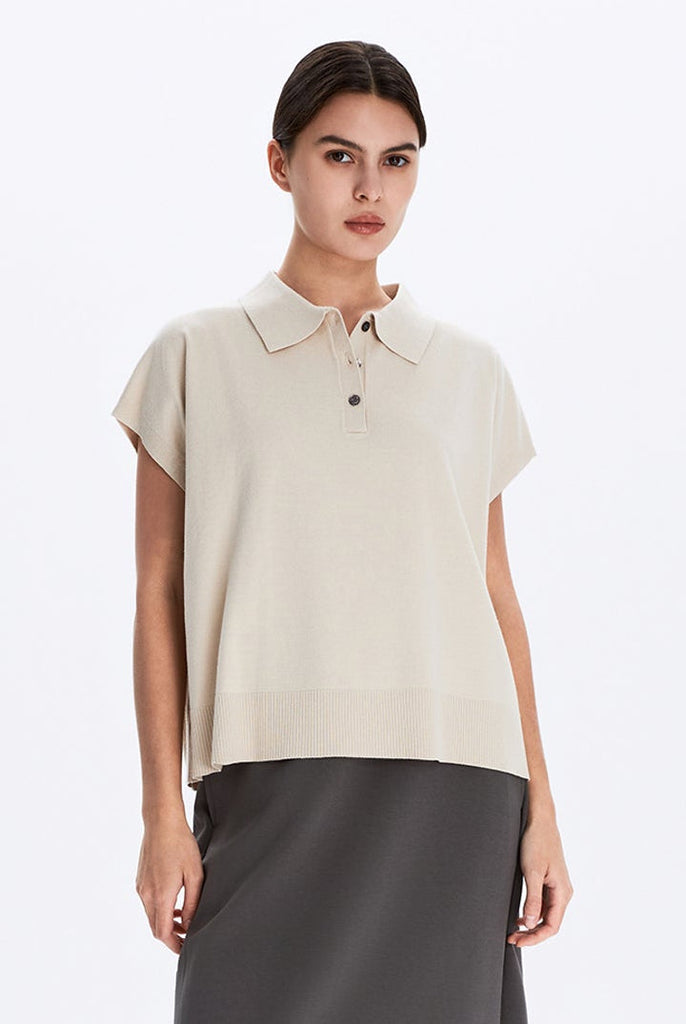 A polished knit with a relaxed edge. This boxy sweater polo top features a structured collar and buttoned placket for a refined touch. Knitted in a soft, mid-weight texture, it offers a comfortable drape and modern ease.