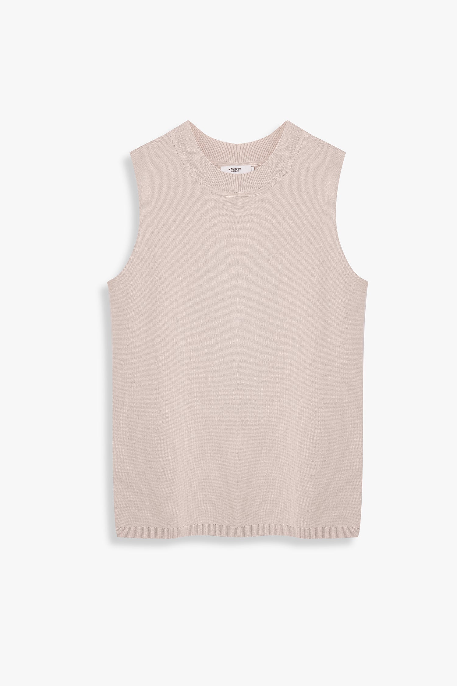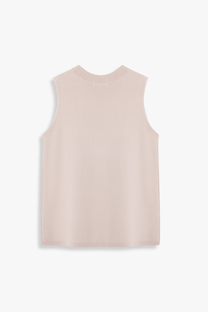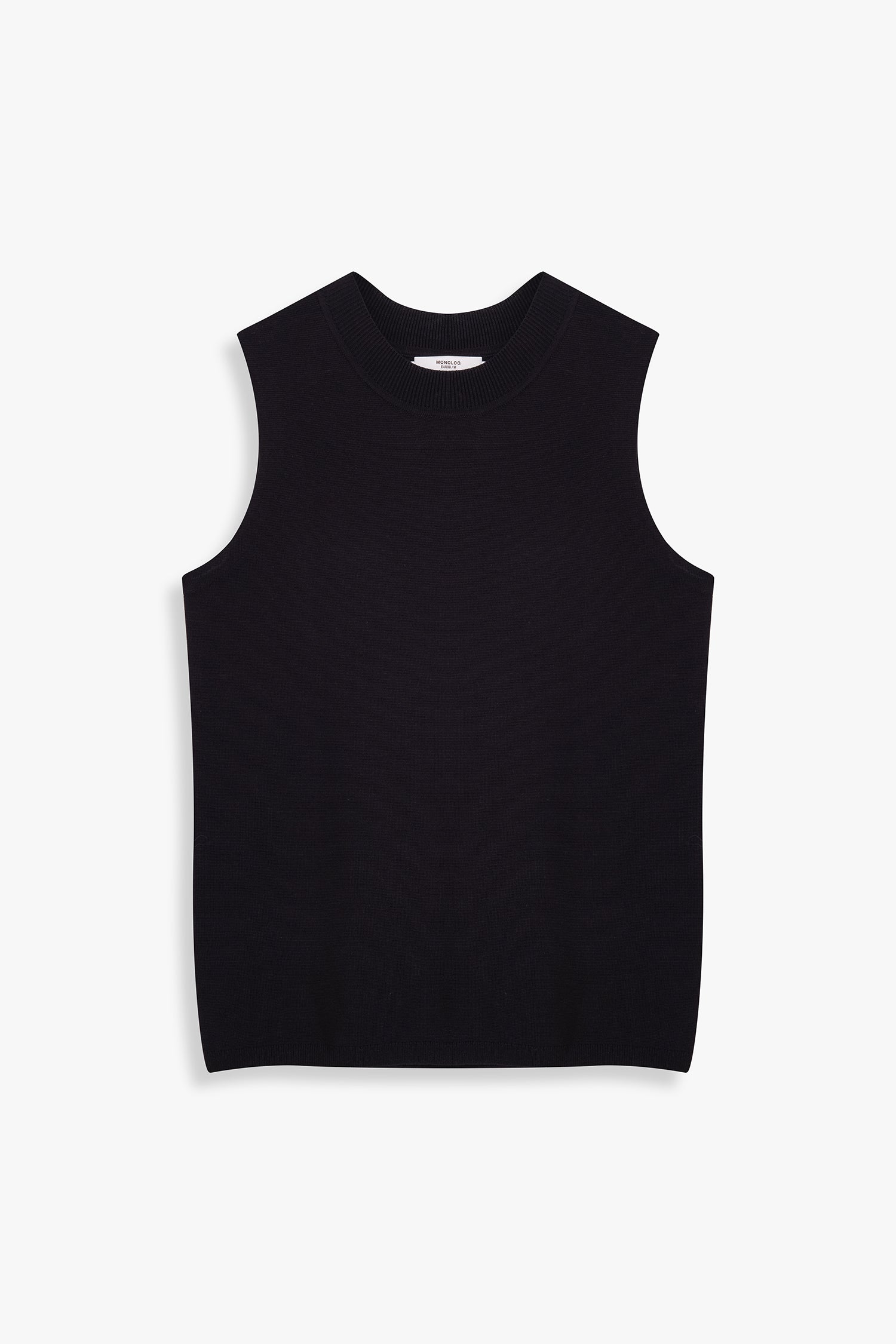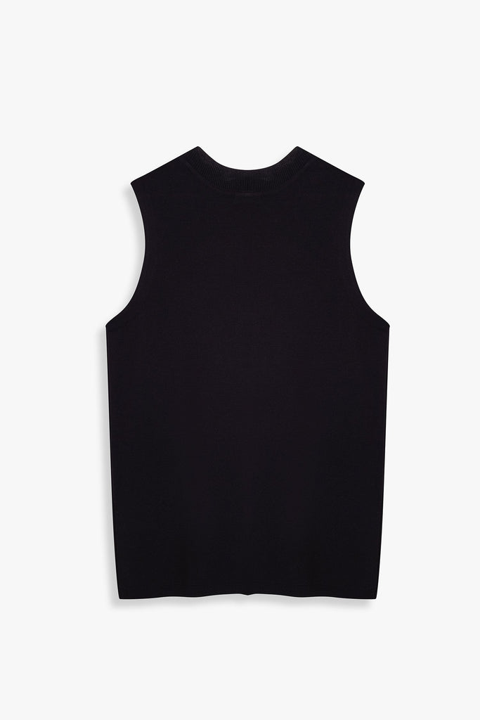 A minimalist knit elevated by subtle structure. This sleeveless top features a round ribbed collar and clean lines that highlight its modern silhouette. Crafted from a soft, fine-gauge knit, it offers effortless comfort and refined simplicity.