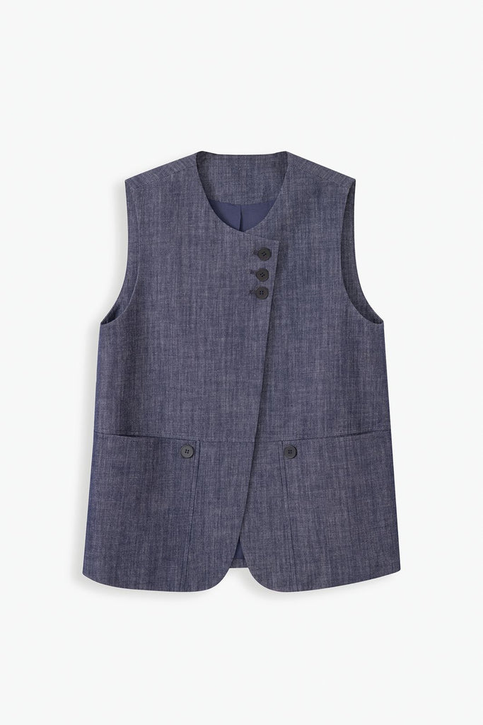 A modern reinterpretation of classic tailoring. This gilet(vest) features a clean, structured silhouette with an asymmetric front closure. Front seam pockets with button details add a subtle utilitarian touch, balancing refinement with practicality. Made in a denim-like fabric that