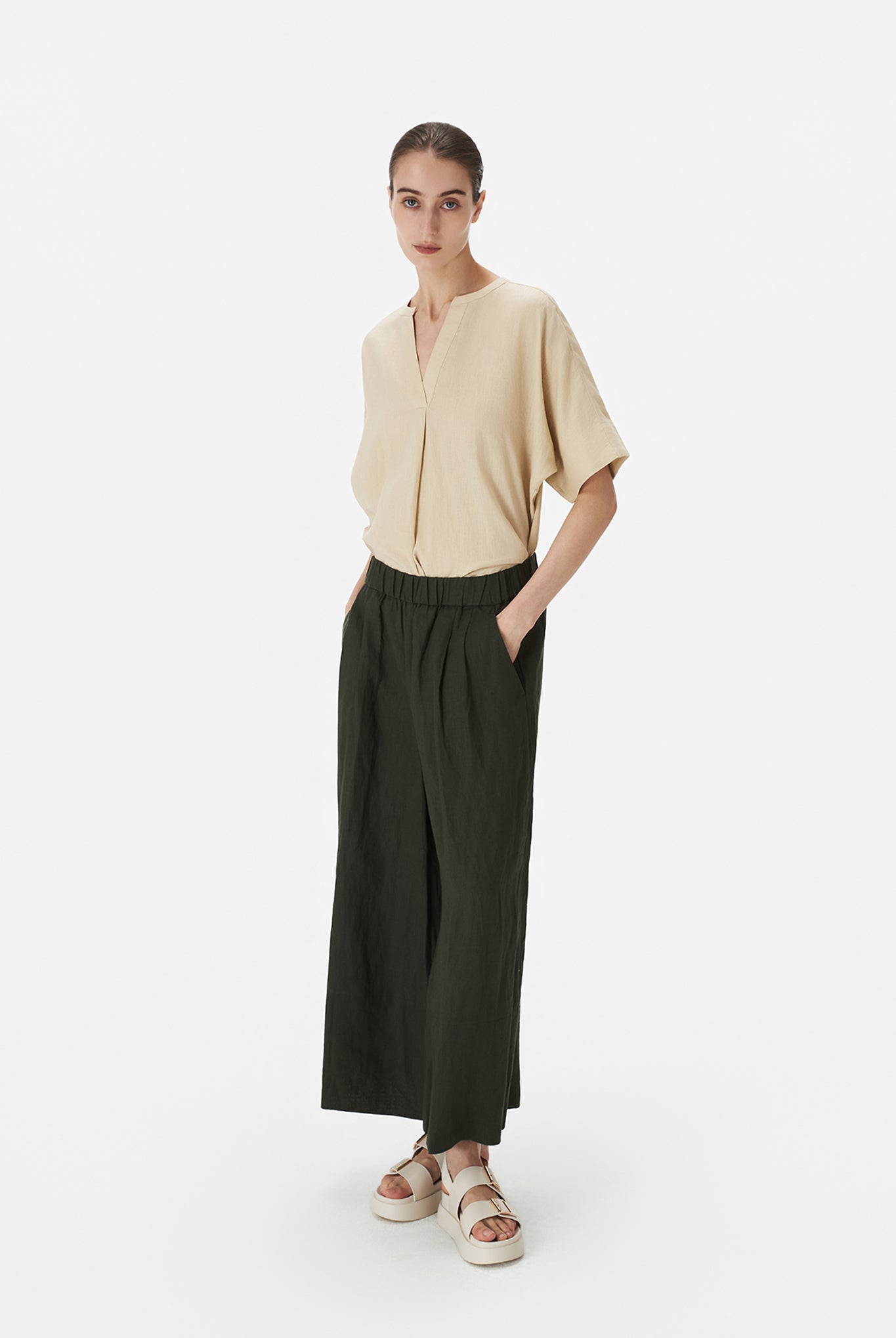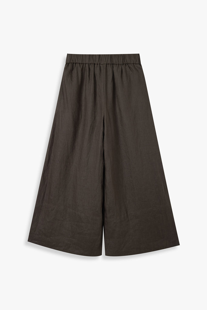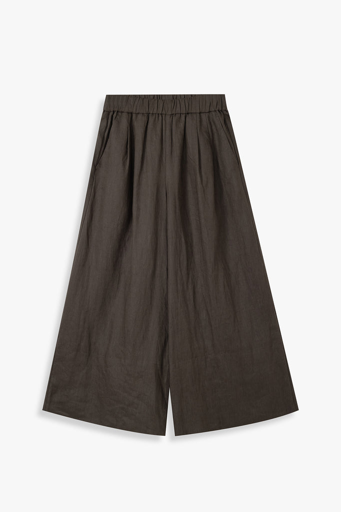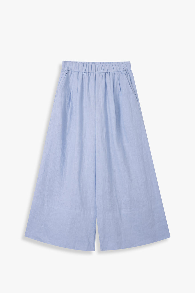 A pair of relaxed full-length pants made in summer-friendly linen for maximum vacation vibes. Featuring pleat detailing at the front and a broad hem detail. Finished with two side pockets and an elasticated drawstring waist for easy wearing.