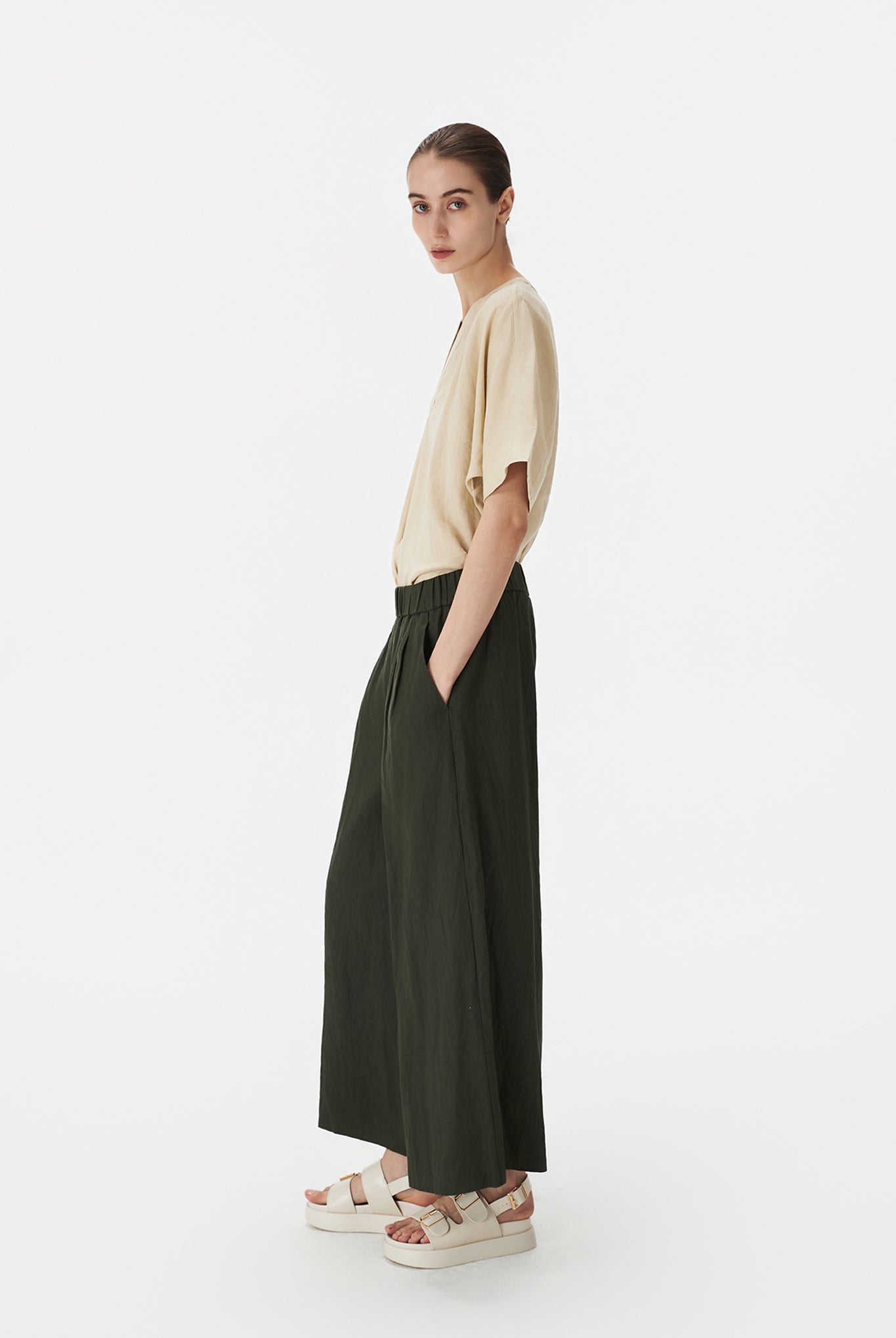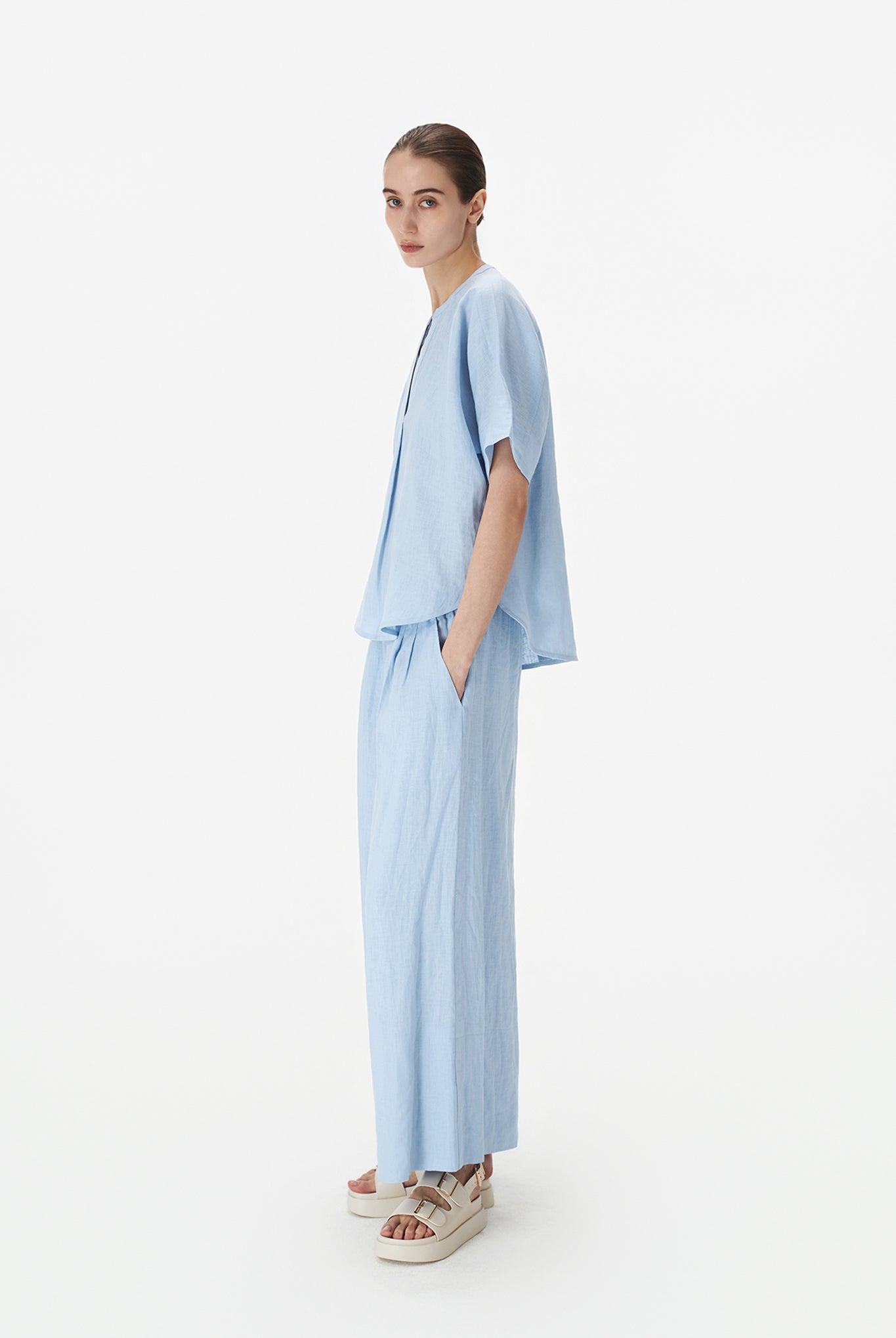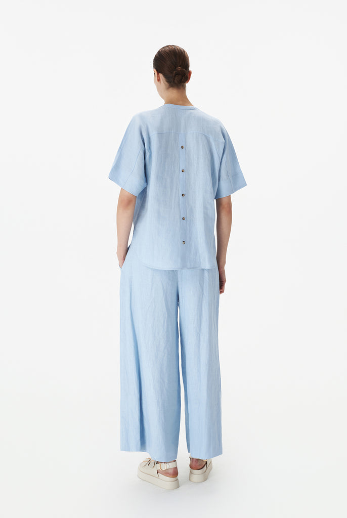A pair of relaxed full-length pants made in summer-friendly linen for maximum vacation vibes. Featuring pleat detailing at the front and a broad hem detail. Finished with two side pockets and an elasticated drawstring waist for easy wearing.